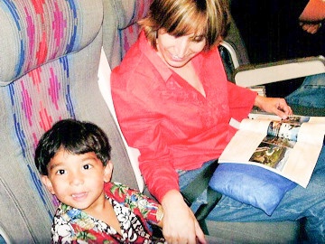 Lukas and Mom on a flight going to Hawaii for his first time. He loved his Hawaiian shirt.